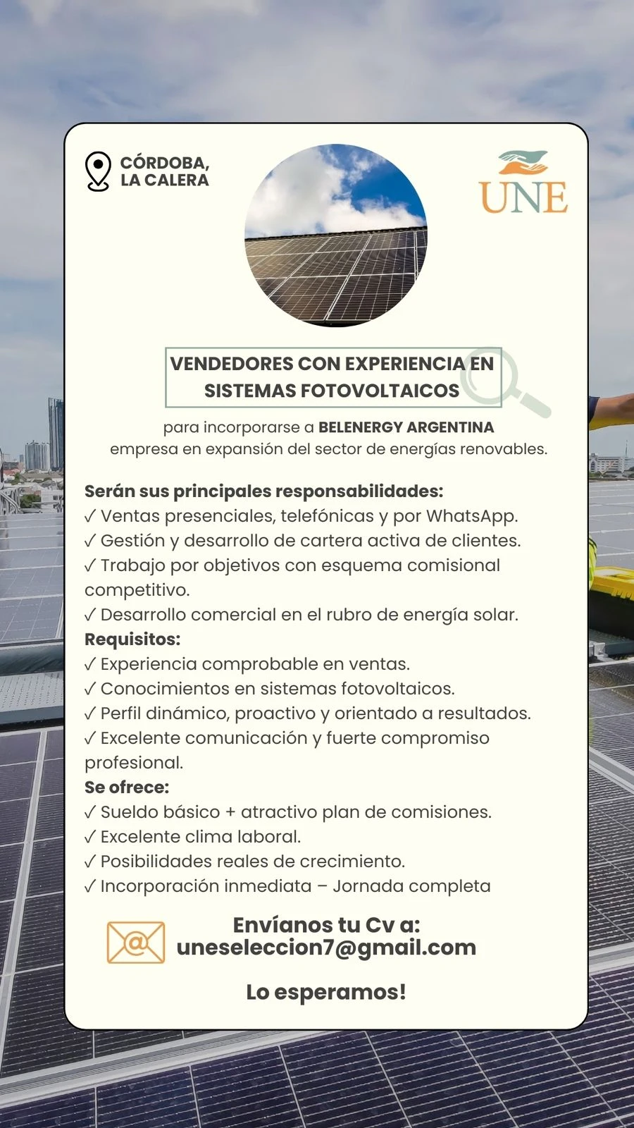 VENDEDORES CON EXPERIENCIA EN SISTEMAS FOTOVOLTAICOS